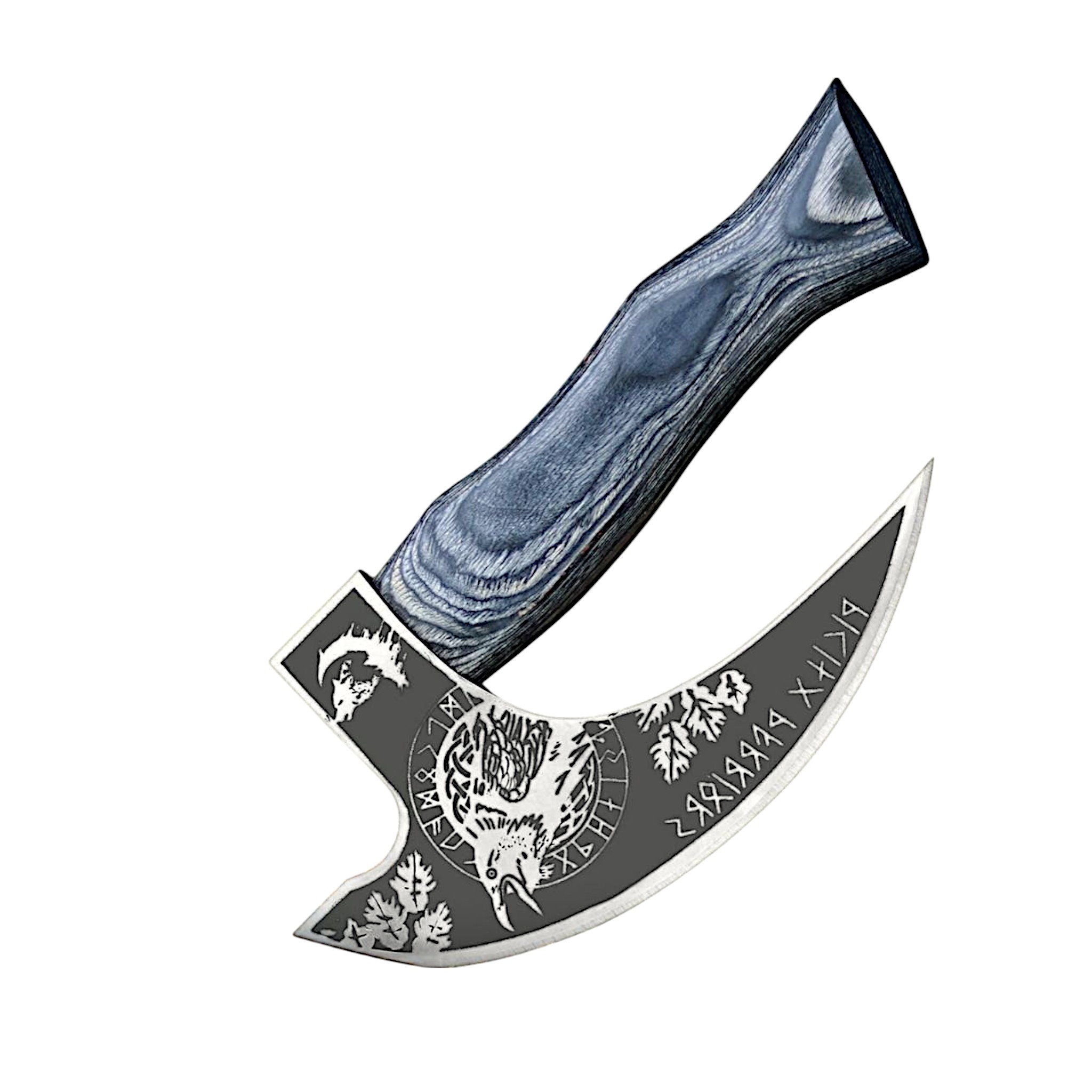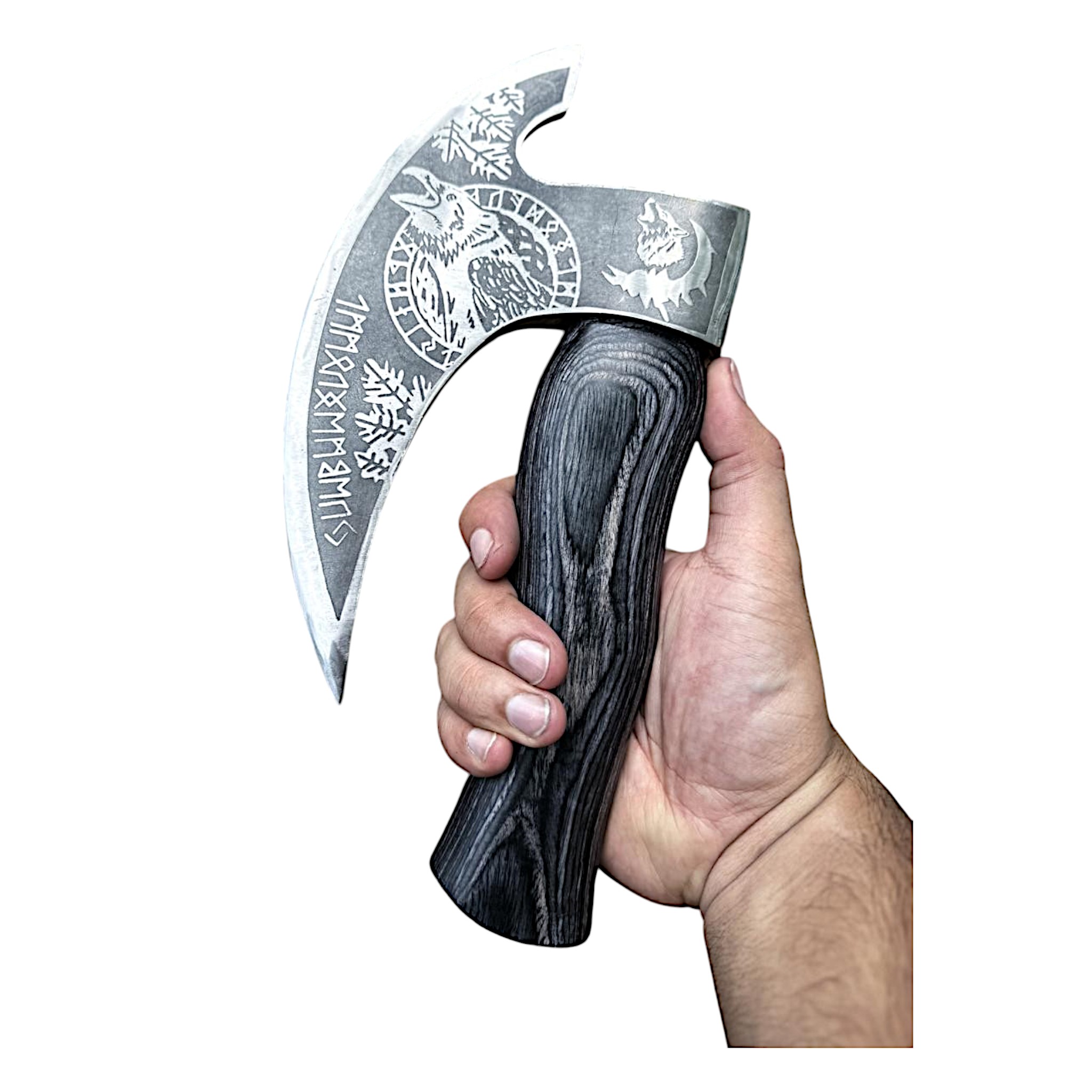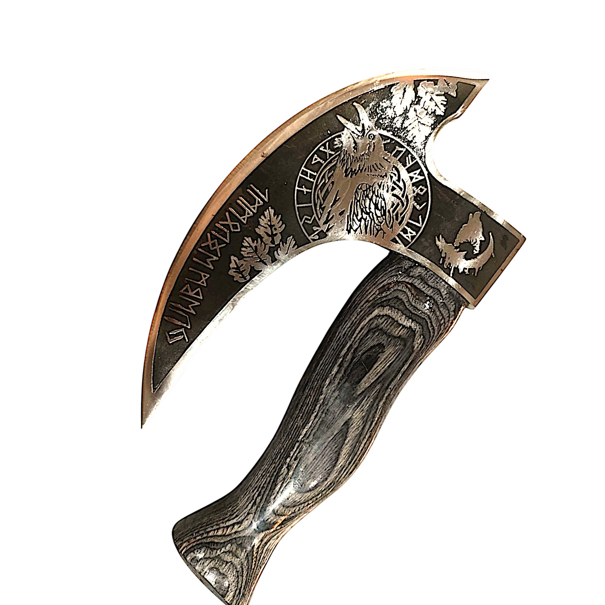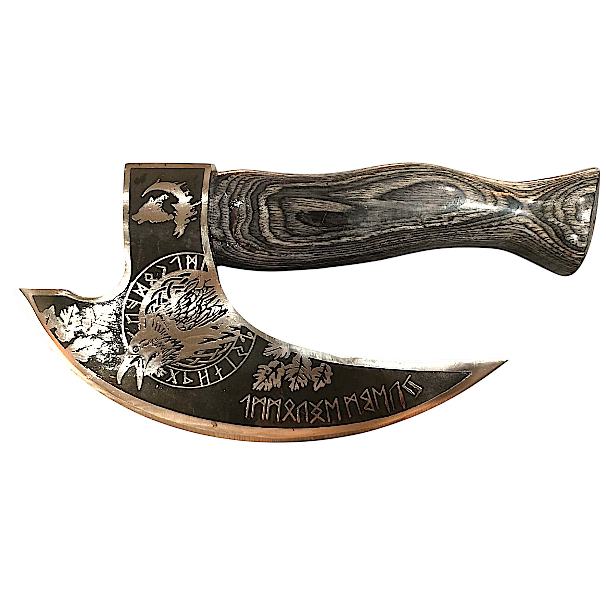 Channel the power of the Vikings with this stunning hand-forged battle axe, featuring a deeply engraved high-carbon steel blade adorned with Norse runes and a powerful raven motif symbolizing wisdom and war. The bearded axe design enhances its cutting efficiency, making it both functional and visually striking. The polished wooden handle is carefully crafted for comfort and durability, complementing the axe’s traditional aesthetic. Whether for historical reenactments, collectors, or as a unique gift for Viking enthusiasts, this axe embodies the perfect fusion of craftsmanship, history, and warrior spirit.