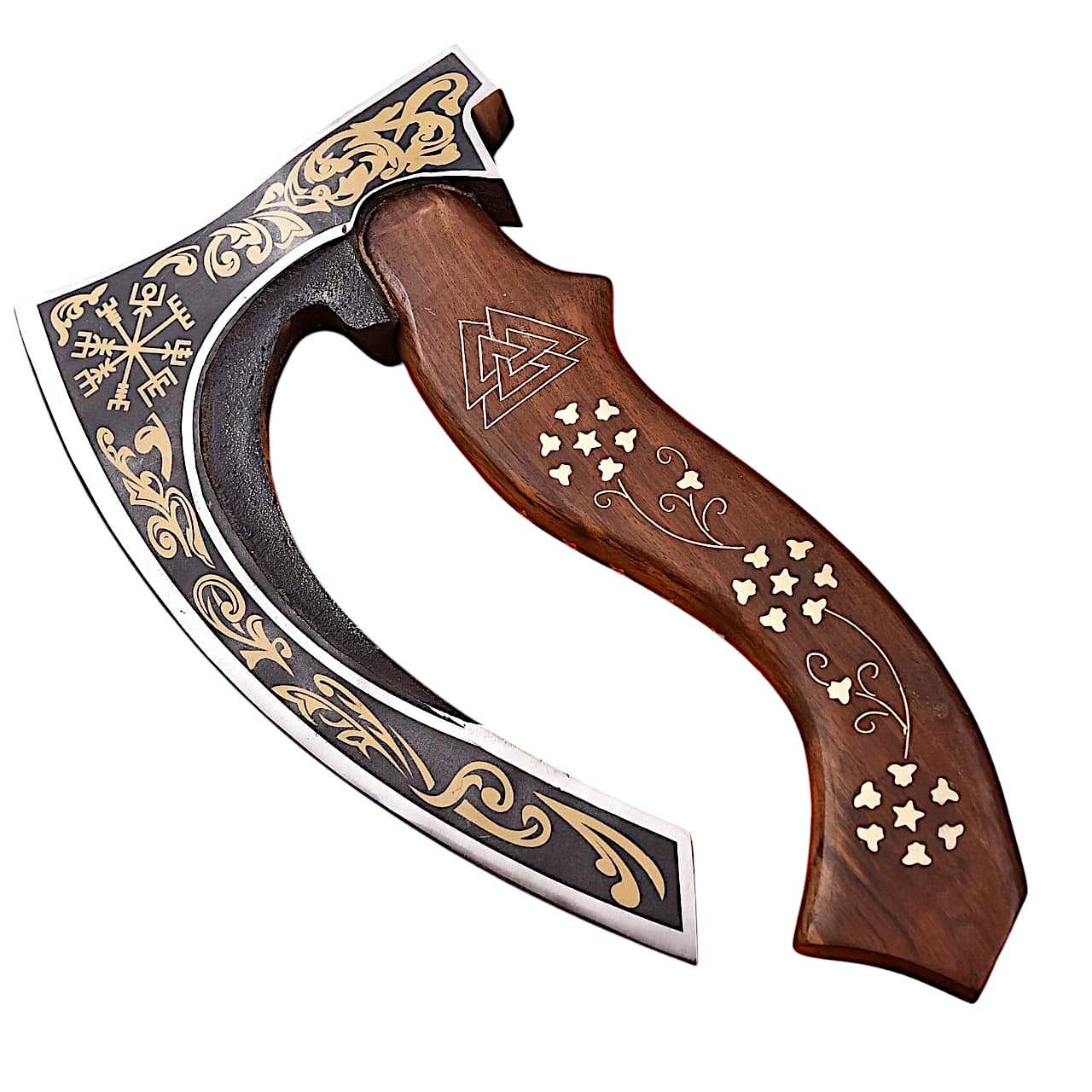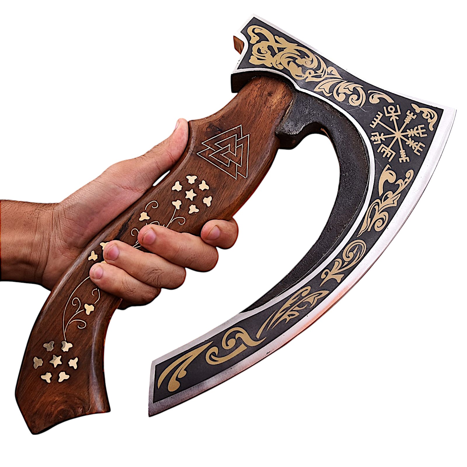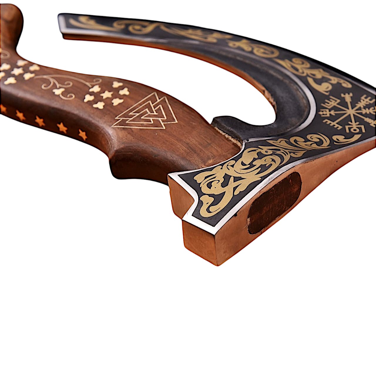 Embrace the warrior spirit with this exquisitely handcrafted Viking bearded axe. Designed with intricate gold inlay, the high-quality carbon steel blade is engraved with traditional Norse patterns and symbols, including the Vegvisir compass for guidance and protection. The ergonomically shaped wooden handle showcases stunning golden floral inlays and the Valknut, a powerful symbol of Odin’s warriors. This masterpiece is not only a functional tool but also a statement piece for collectors, history enthusiasts, and those who appreciate Viking craftsmanship. Ideal for display, gifting, or reenactments, this axe combines beauty with durability for an unparalleled experience.