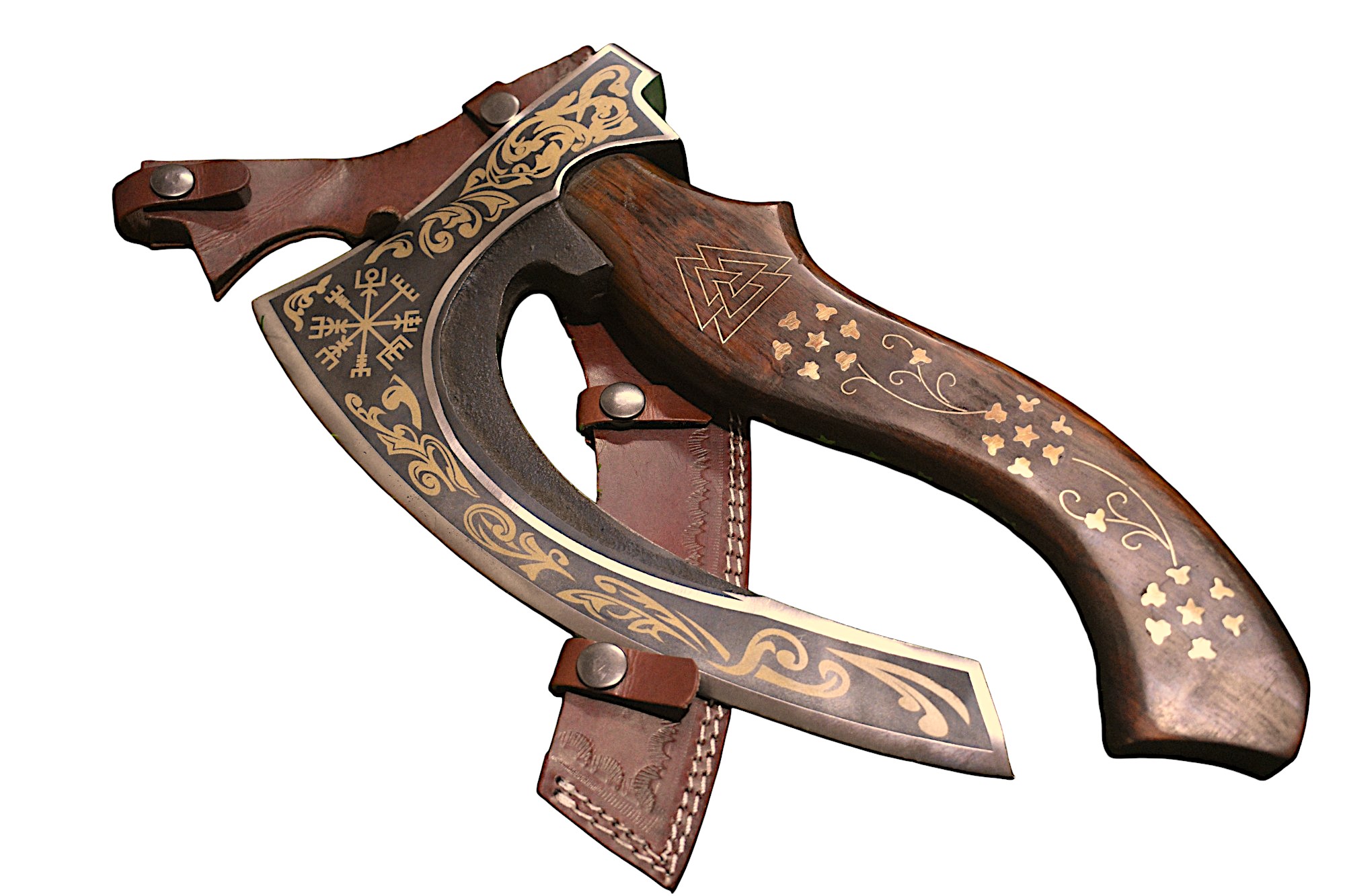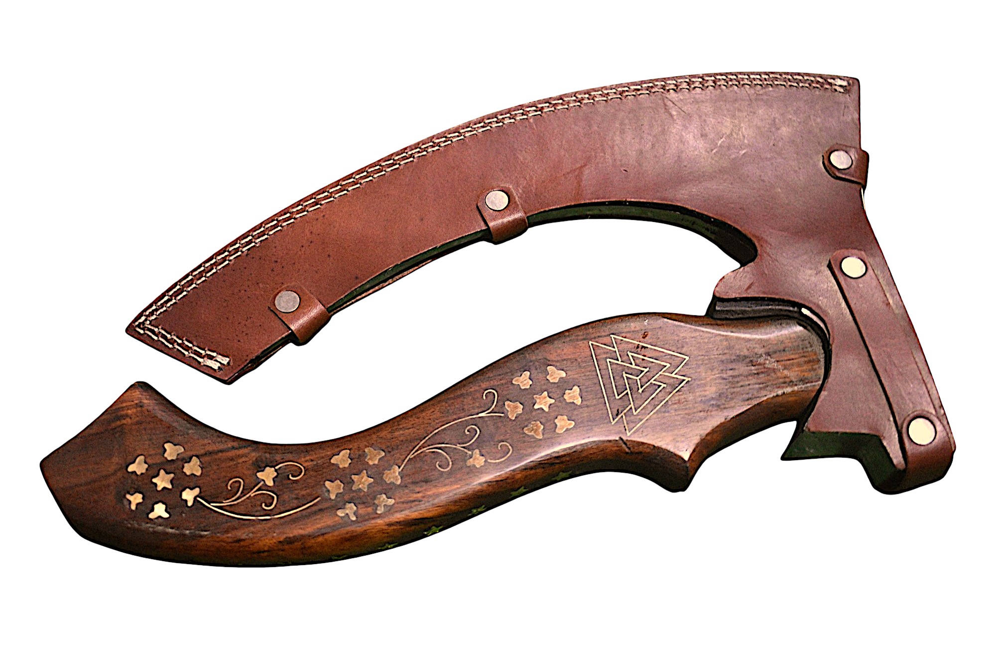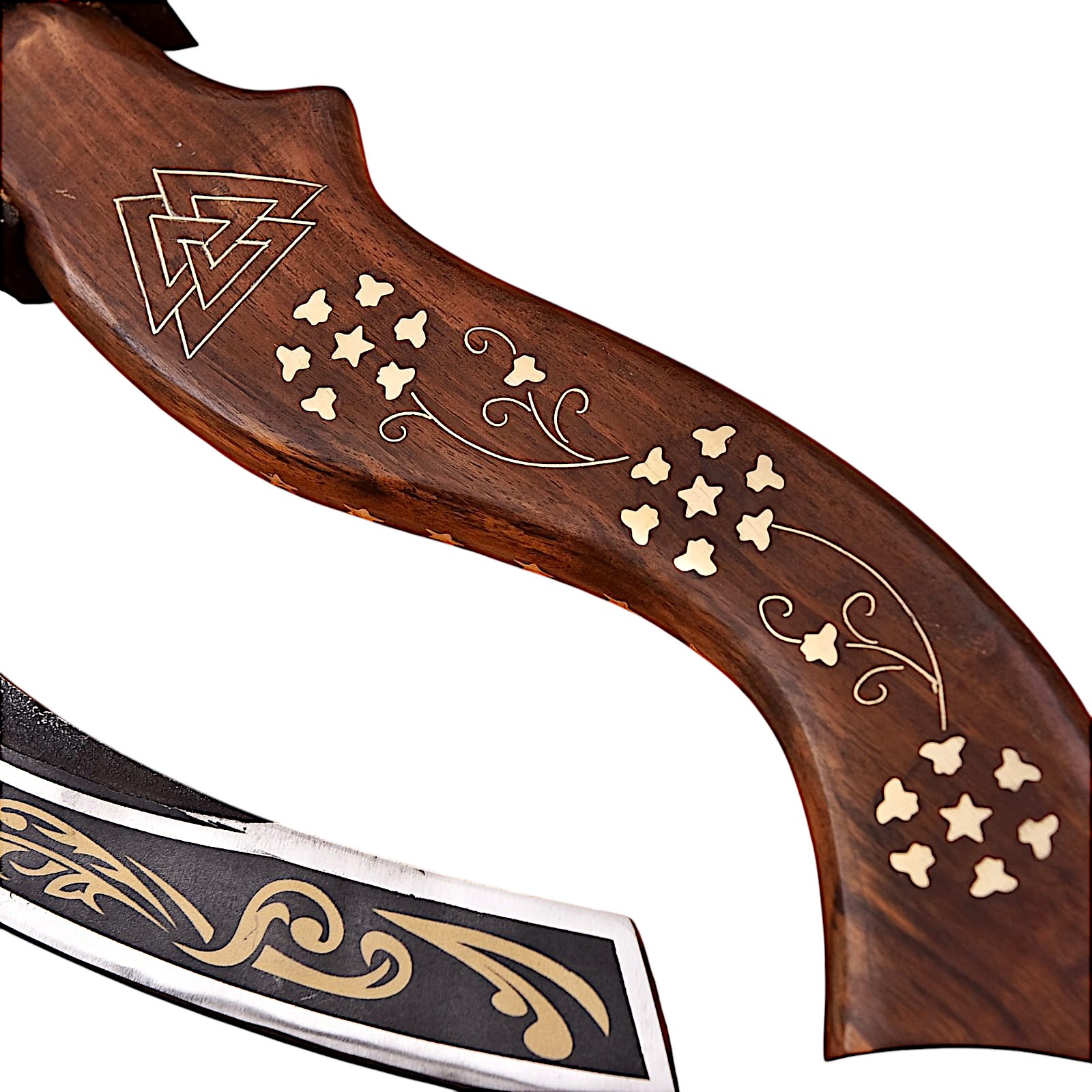 Embrace the warrior spirit with this exquisitely handcrafted Viking bearded axe. Designed with intricate gold inlay, the high-quality carbon steel blade is engraved with traditional Norse patterns and symbols, including the Vegvisir compass for guidance and protection. The ergonomically shaped wooden handle showcases stunning golden floral inlays and the Valknut, a powerful symbol of Odin’s warriors. This masterpiece is not only a functional tool but also a statement piece for collectors, history enthusiasts, and those who appreciate Viking craftsmanship. Ideal for display, gifting, or reenactments, this axe combines beauty with durability for an unparalleled experience.