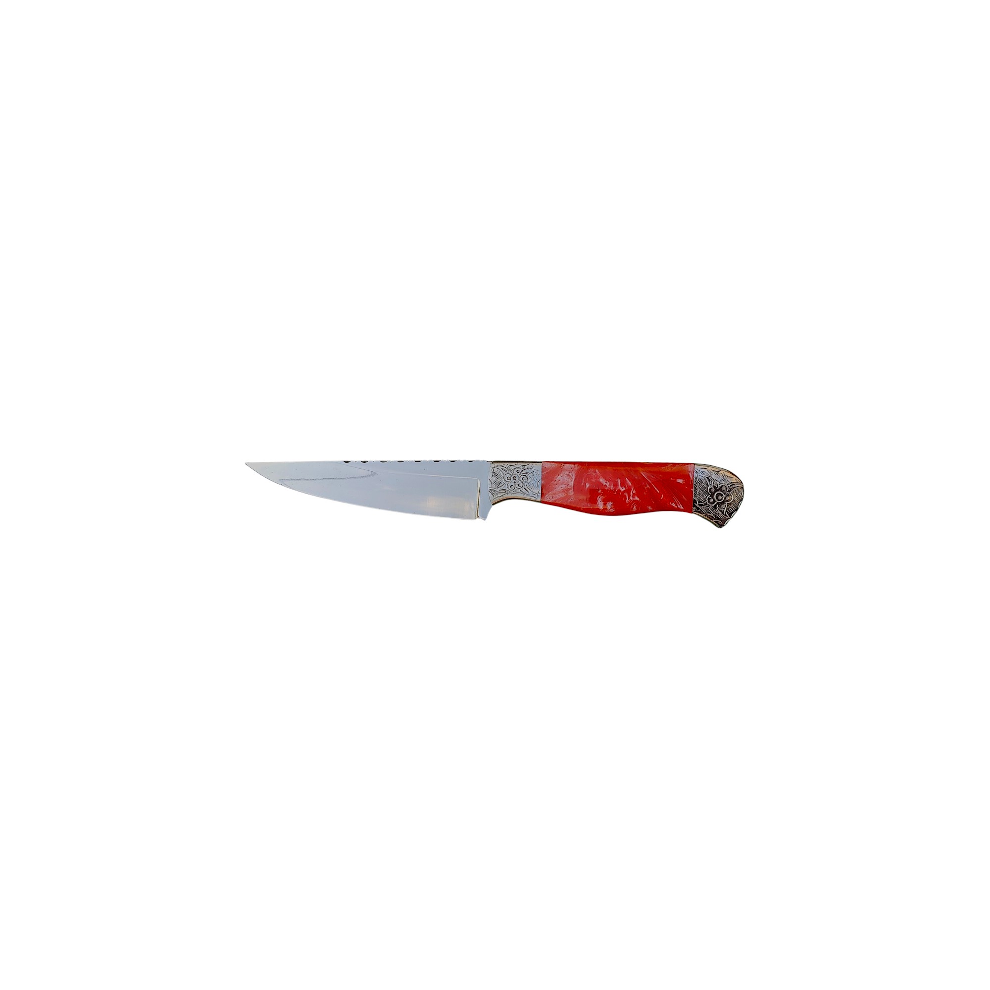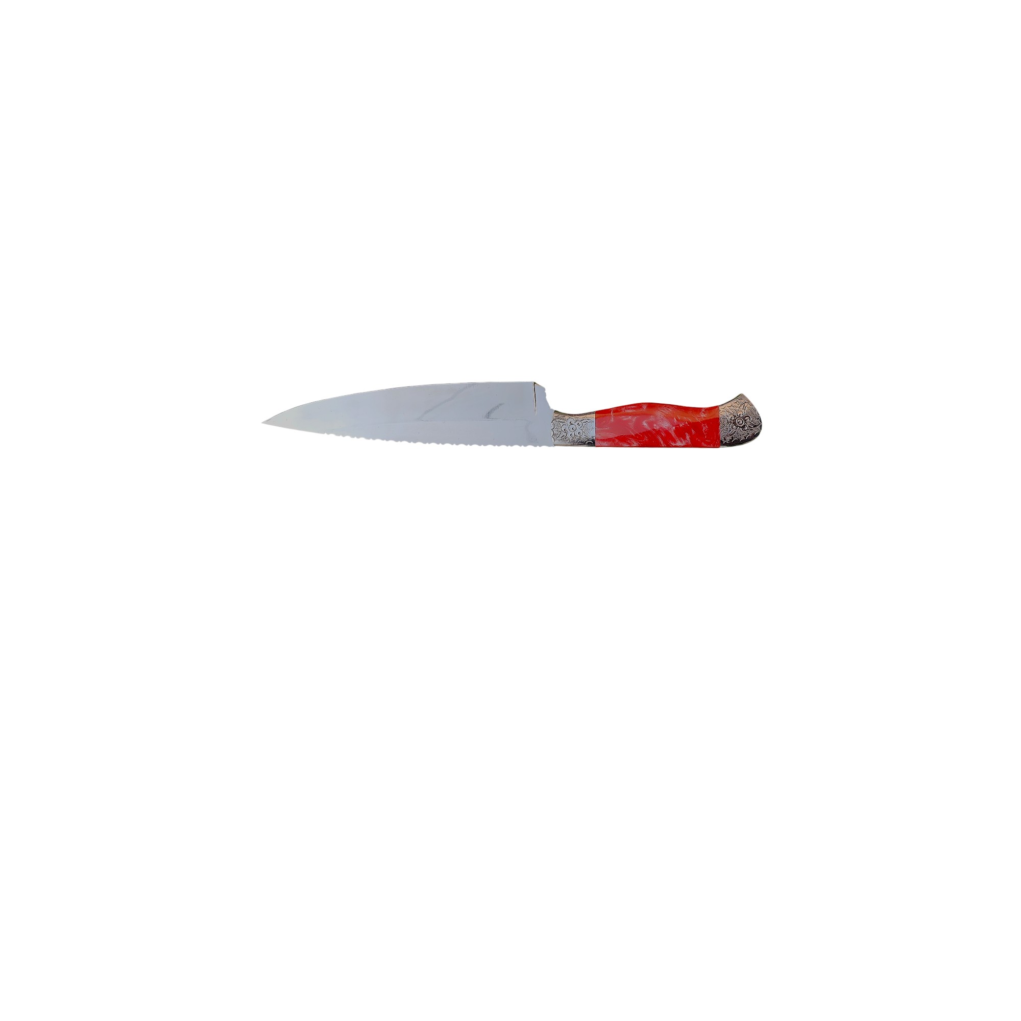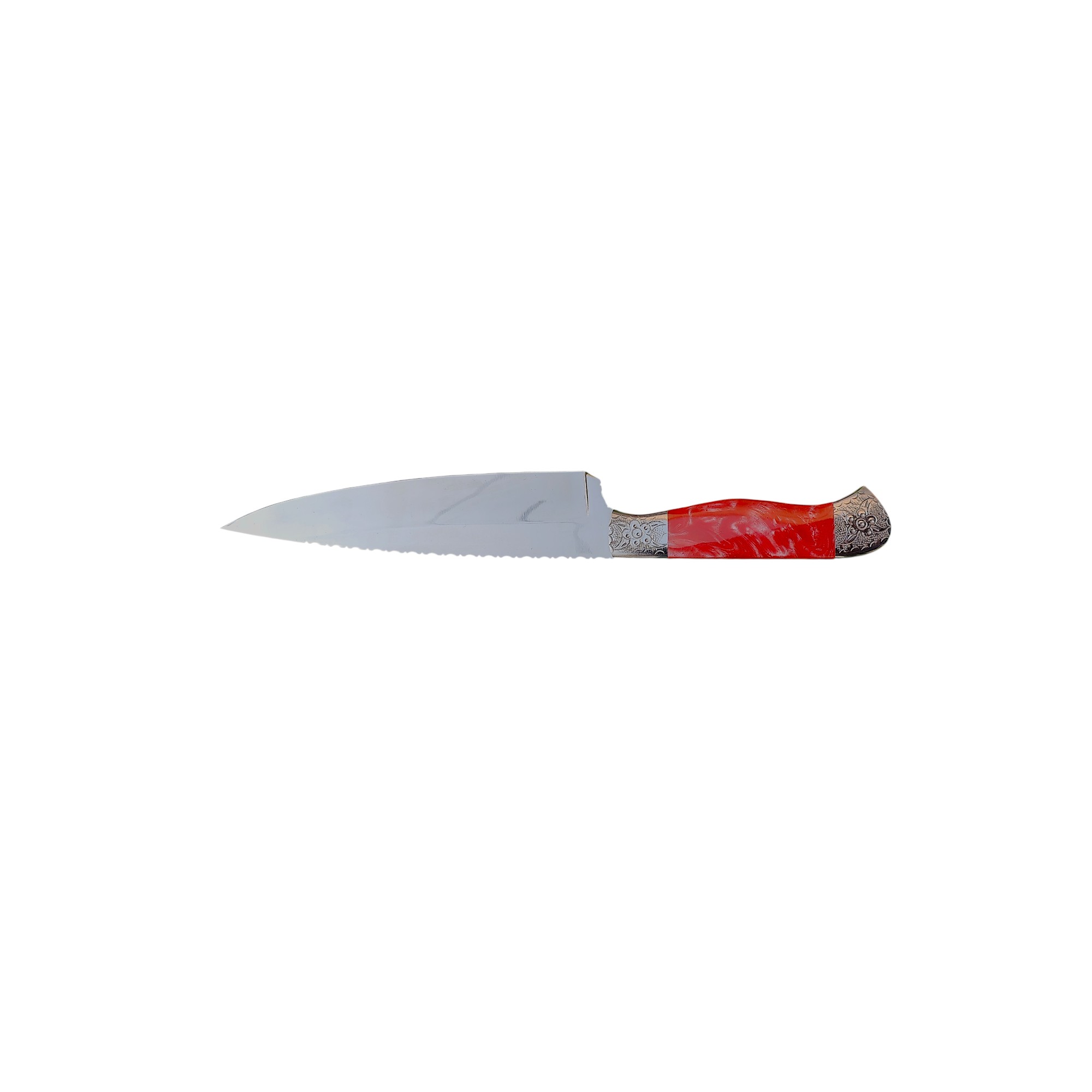 Unique Description: Elevate your kitchen with this distinguished five-piece culinary knife set, blending exceptional functionality with intricate artistry. Each knife features a polished, sharp blade, with some boasting a serrated edge for versatile cutting tasks. The striking highlight is the meticulously crafted silver-toned bolsters, adorned with ornate, floral-inspired engravings, which beautifully complement the sleek black handles. This collection is a testament to both precision and elegance, perfect for discerning chefs and collectors alike.