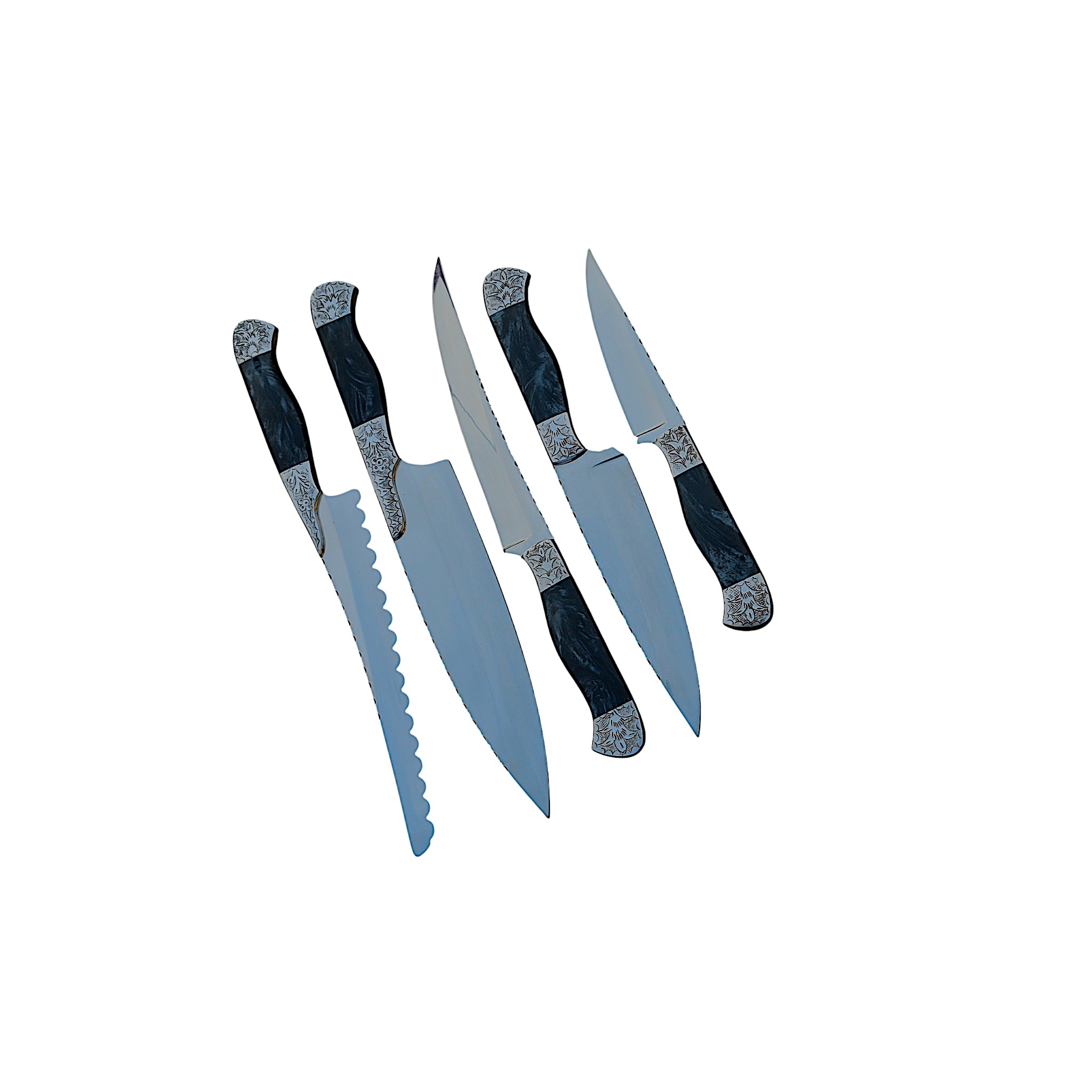 Elevate your kitchen with this distinguished five-piece culinary knife set, blending exceptional functionality with intricate artistry. Each knife features a polished, sharp blade, with some boasting a serrated edge for versatile cutting tasks. The striking highlight is the meticulously crafted silver-toned bolsters, adorned with ornate, floral-inspired engravings, which beautifully complement the sleek black handles. This collection is a testament to both precision and elegance, perfect for discerning chefs and collectors alike.